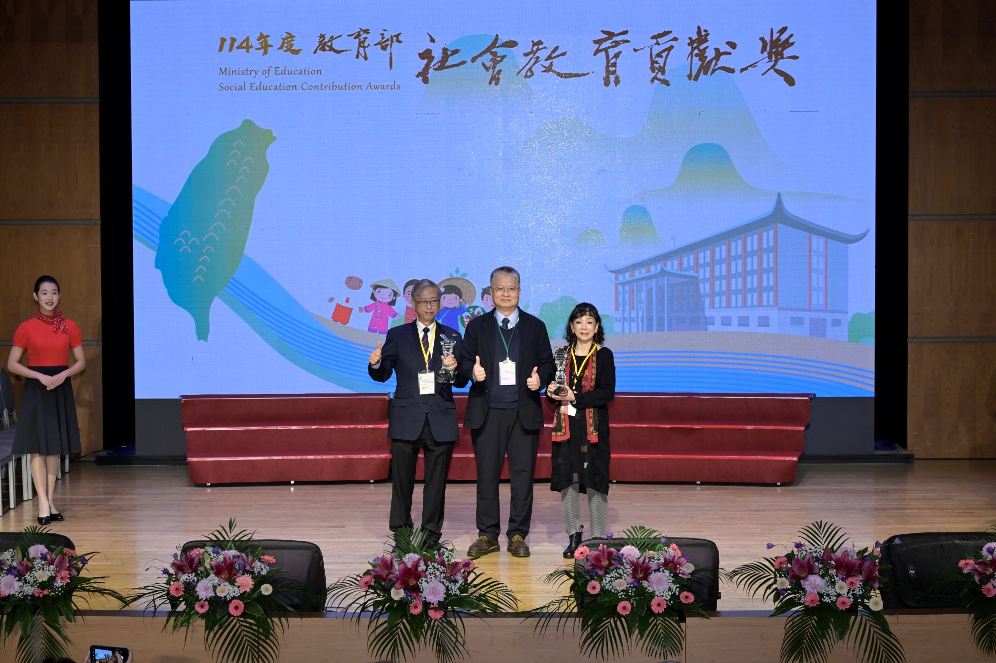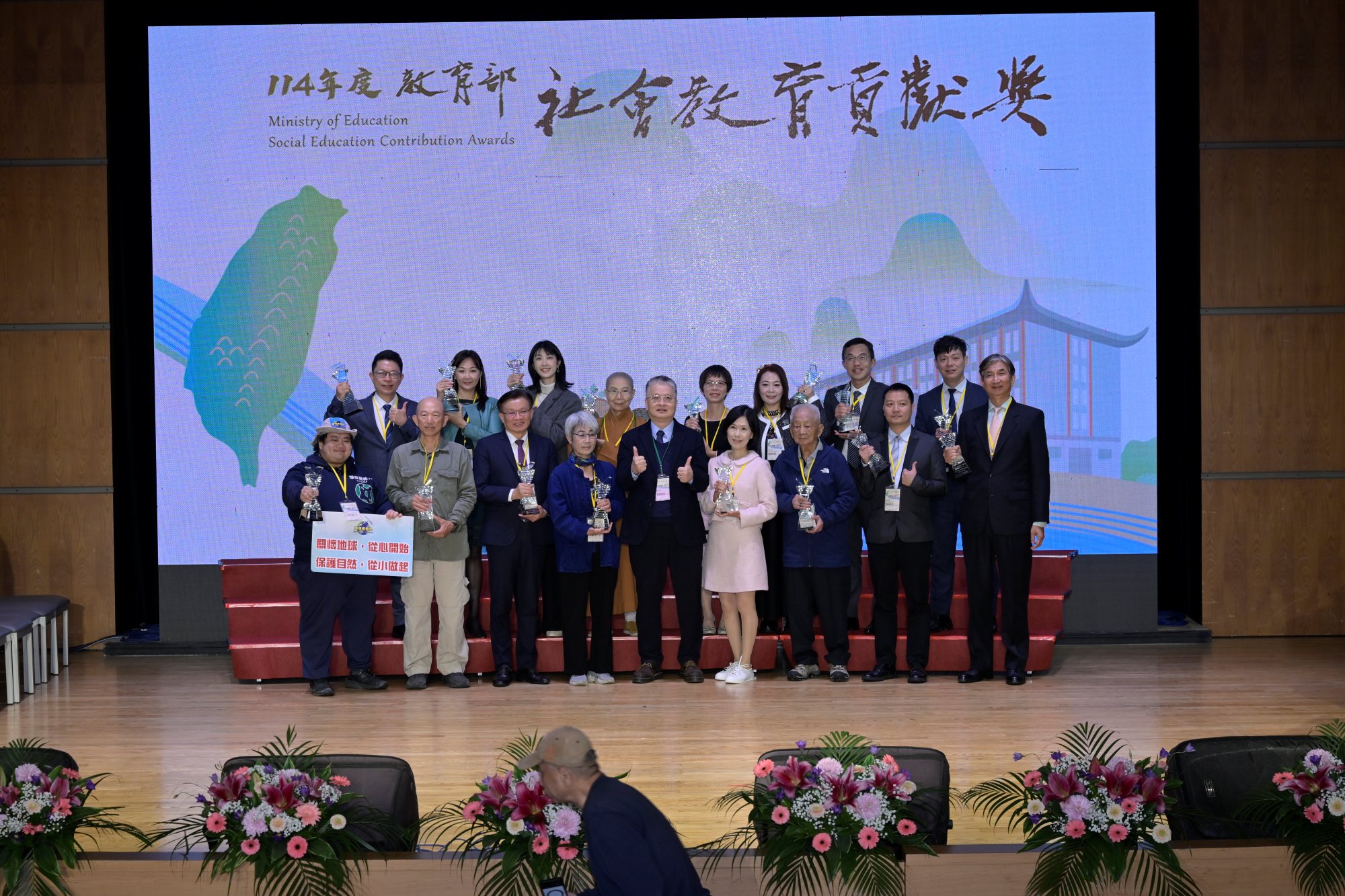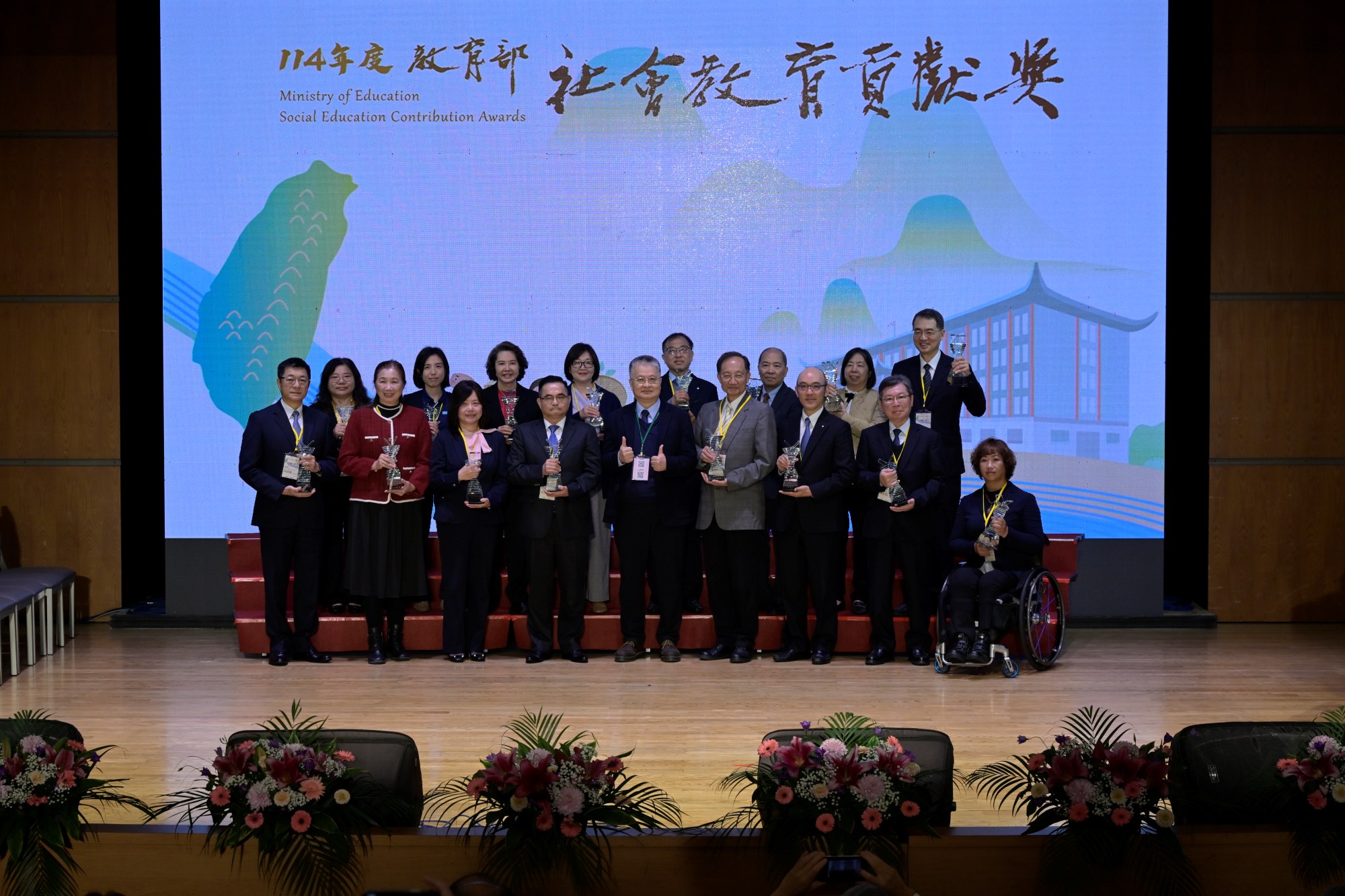 教育部為表揚對社會教育具卓越貢獻的個人及團體,於今(16)日下午在國立臺灣圖書館B1演藝廳辦理「114年度社會教育貢獻獎頒獎典禮」。114年度社會教育貢獻獎由各中央、地方機關初審推薦並進入複審的優秀個人及團體計約90件,經評審小組複審、決審評定各組獲獎人,計有終身奉獻獎2人、個人獎16人及團體獎16組,並由教育部辦理頒獎典禮予以嘉許表達祝賀與感謝。