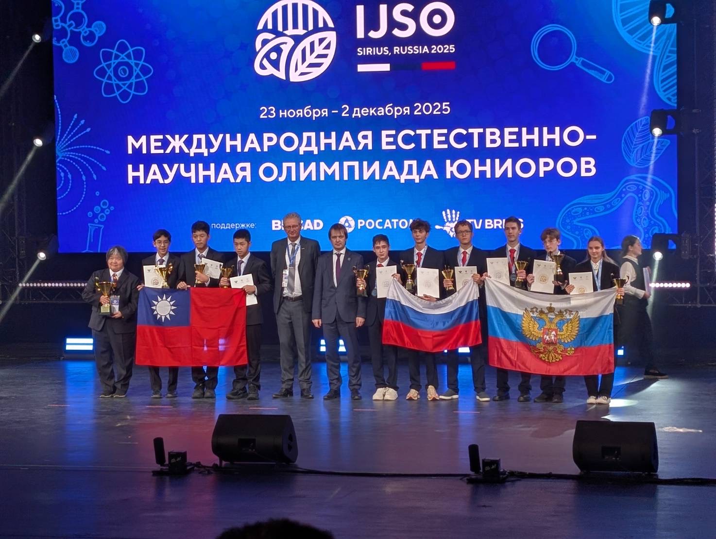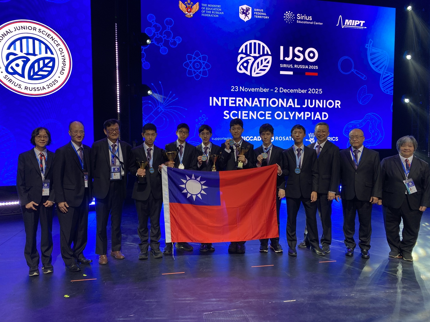 我國參加2025「第22屆國際國中科學奧林匹亞競賽(IJSO)」,成績於12月1日晚間傳來捷報,本屆競賽由俄羅斯主辦,在24個國家(地區)、125名參賽學生中,我國代表隊6位學生共獲得4金2銀佳績,另有1組學生獲得實驗銅牌獎,成績國際排名為第2名,僅次於主辦國俄羅斯。代表隊學生為臺北市立建國高級中學林鈺洋、潘又睿及姜翔、桃園市立文昌國民中學蕭睿希、臺中市立臺中第一高級中學馬宇辰、高雄市立高雄高級中學康睿騰。教育部長鄭英耀獲知好消息後也立即發出賀電,恭喜他們的努力獲得豐碩成果,並為臺灣爭光。
