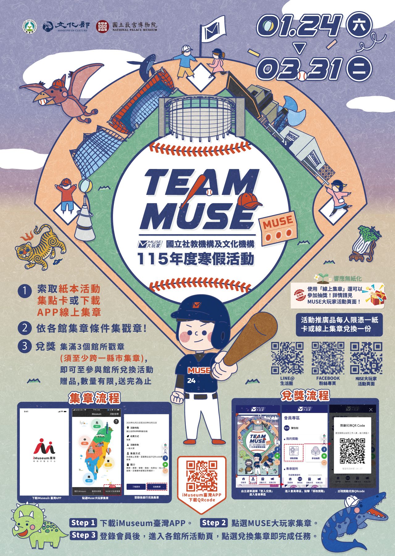 寒假及春節假期即將來臨,教育部結合所屬館所、國立故宮博物院及文化部所屬文化機構,舉辦「MUSE大玩家-Team MUSE」系列活動,持續推出「陸、海、空恐龍戰隊」-三角龍、滄龍、翼龍三種恐龍推廣品,象徵對不同知識領域的勇敢探索。各館限定一款恐龍戰隊夥伴,鼓勵民眾在活動期間(115年1月24日至3月31日)走訪各地館所,參與各具特色的展演、營隊活動,體驗全臺社教與文化館所的多樣魅力,集章兌換恐龍戰隊推廣品。