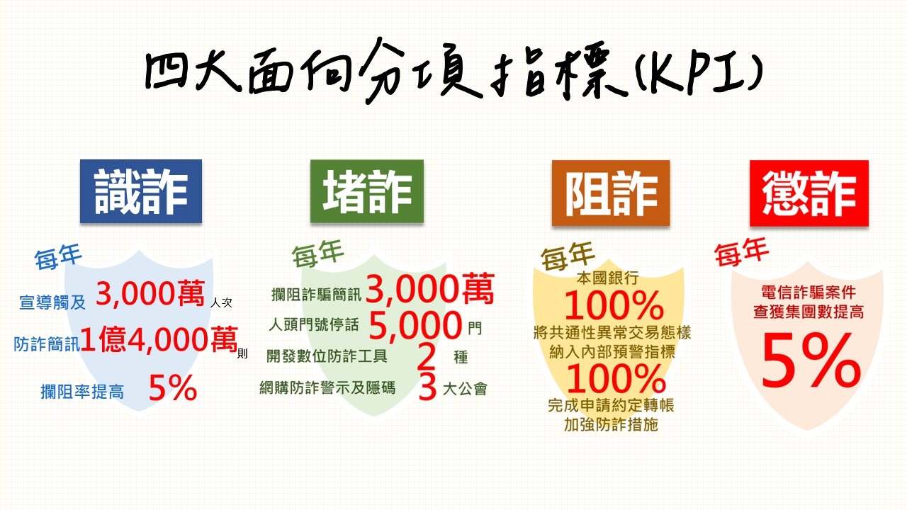 行政院於112年5月22日訂定發布《行政院打擊詐欺辦公室設置要點》,行政院打擊詐欺辦公室於112年5月31日正式揭牌,未來將負責統籌、督導及協調各部會打詐力量,運用公私協力推動各項防詐作為,並透過電信、網路及金流面等各項防制措施,有效達到達到「減少接觸、減少誤信、減少損害」3減目標,以全面降低詐騙受害事件。